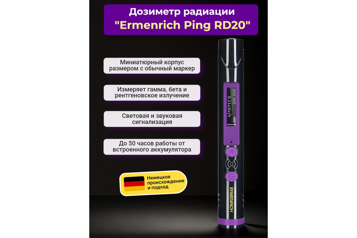 Легкий корпус с защитой IP3X — дозиметр "Ermenrich Ping RD20" изготовлен в компактном корпусе из пластика и имеет цилиндрическую форму. По внешнему виду он напоминает маркер, который удобно носить в кармане (для этого на корпусе имеется специальная клипса). Прибор является бытовым, пользоваться им может каждый, для этого не требуются специальные знания в области радиобиологии. Он измеряет текущий уровень радиации у различных объектов, а также помогает найти радиоактивные пятна на земле и в окружающей среде.