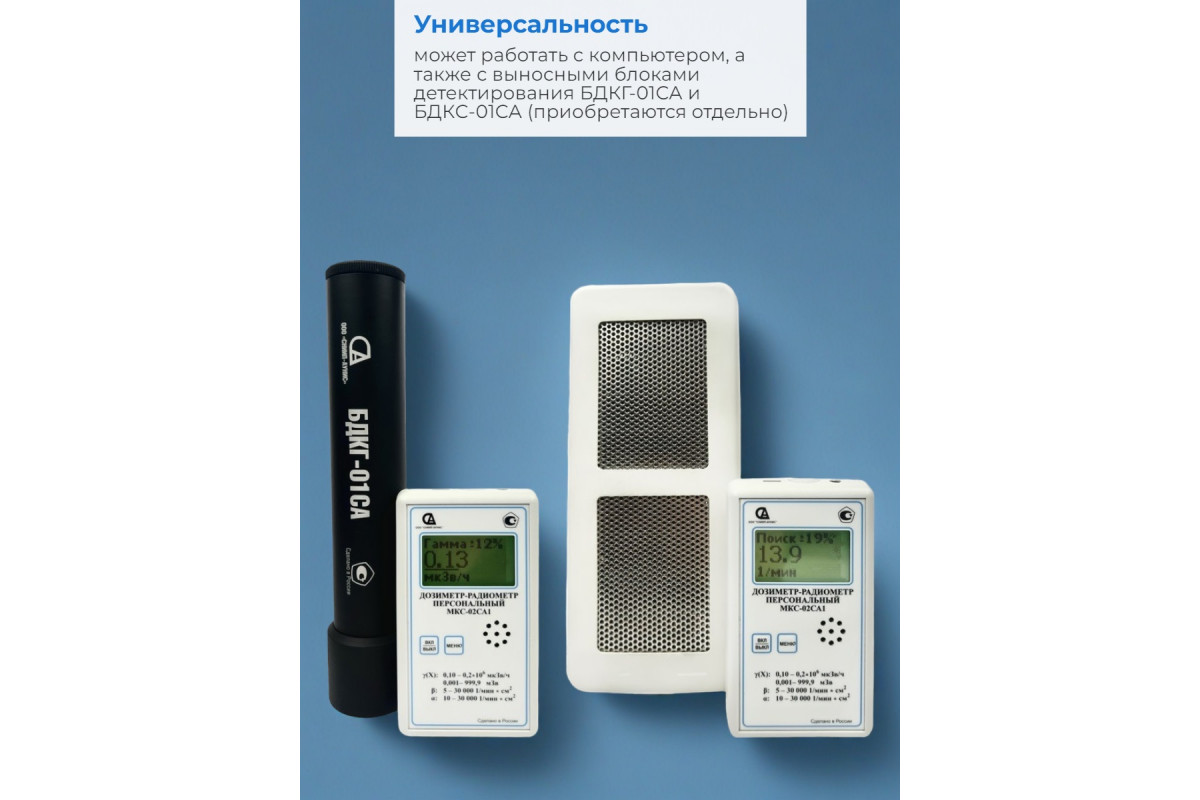 Подключение внешних блоков детектирования — данная модель дозиметра-радиометра совместима с внешними блоками детектирования БДКГ-01СА и БДКС-01СА. Такие блоки используются в санитарно-эпидемиологических службах, на объектах атомной энергетики, в медицинских и научных учреждениях и т.д. При подключении к дозиметру они в значительной степени увеличивают чувствительность прибора, а также скорость его работы. Выносные блоки могут устанавливаться на телескопическую штангу для удобства работы пользователя в труднодоступных местах.
