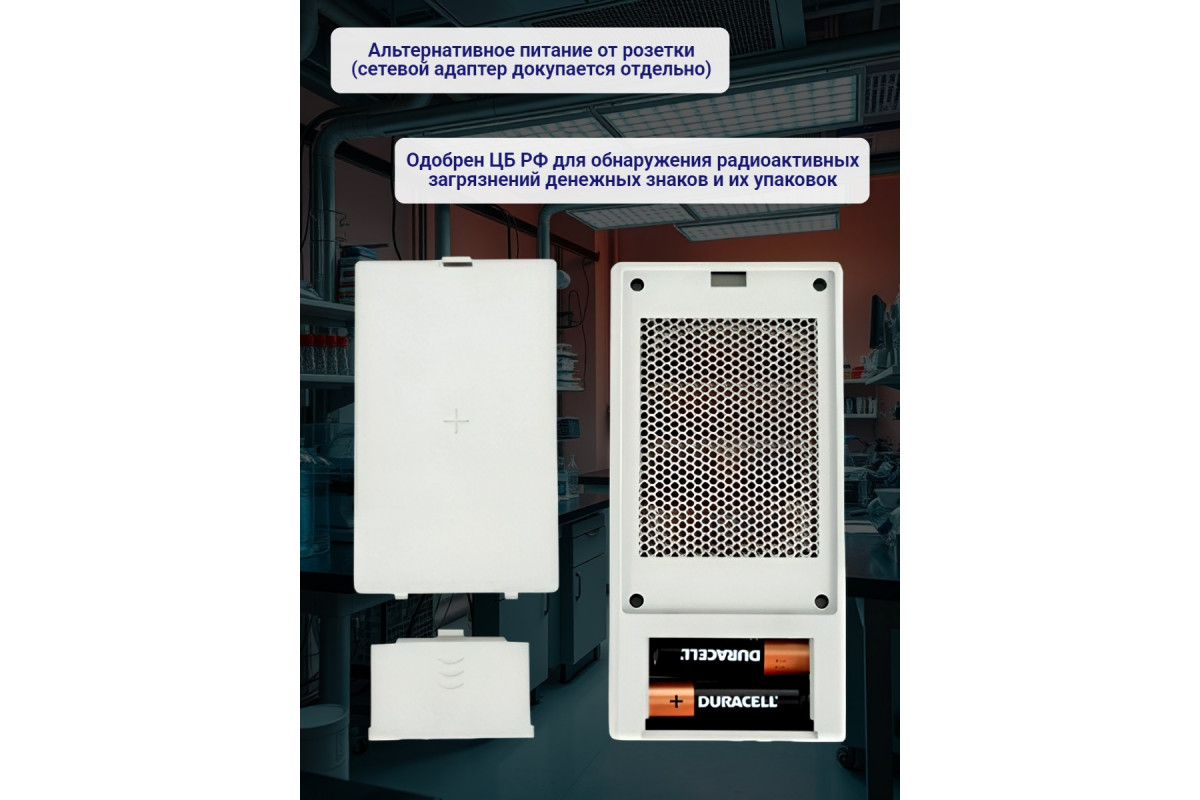 - Высокоточный газоразрядный счетчик регистрирует альфа-, бета- и гамма-излучения, позволяет проверять окружающий фон и конкретные предметы, имеет режим поиска ближайшего источника радиации.