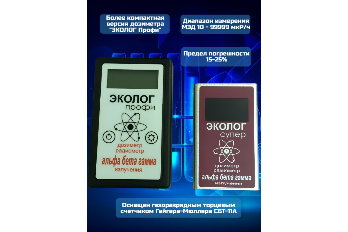 Модель профессионального дозиметра "ЭКОЛОГ Супер" разработана отечественными специалистами и предназначена для использования различными службами: таможня, МЧС, военные, а также для промышленных и строительных предприятий, медицинских учреждений и т.д. Данное устройство позволяет обнаружить источники ионизирующего излучения, радиоактивные пятна и объекты с повышенным уровнем радиации. Дозиметр измеряет мощность амбиентного эквивалента дозы гамма (рентгеновского) излучения, мощность экспозиционной дозы гамма (рентгеновского) излучения, плотность потока альфа- и бета-частиц и ряд других показателей. Модель отличается компактным размером, богатым функционалом и удобным управлением, включая голосовое озвучивание результатов измерений. Вся информация отображается на дисплее в цифровом и текстовом виде, кроме того, прибор имеет звуковую сигнализацию и сигналы оповещения (щелчки, звуки). Внутри корпуса установлен современный счетчик "СБТ-11А", время измерения составляет всего 5 секунд. Прибор работает автономно от встроенного аккумулятора, что позволяет использовать его в любом месте.