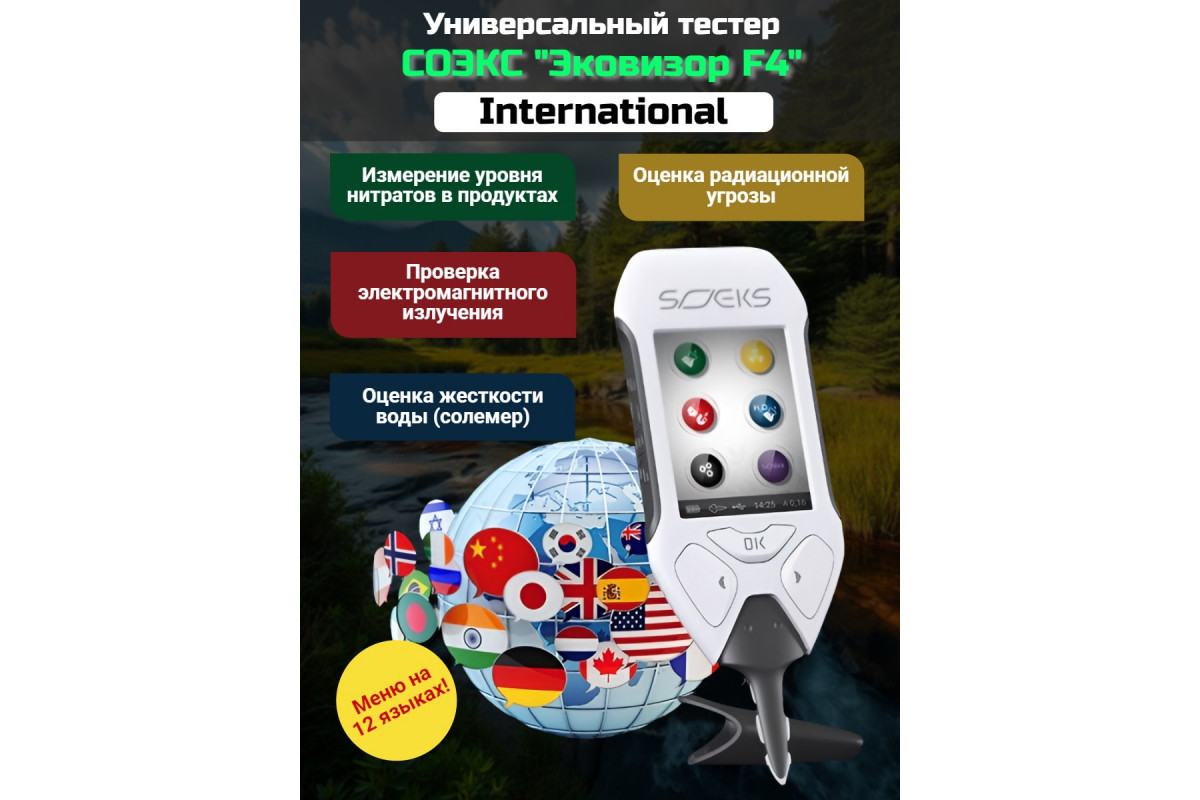 Эковизор "СОЭКС F4 International" — это специальная версия многофункционального дозиметра 4в1 "СОЭКС F4", которая отличается тем, что имеет интерфейс, переведенный на 12 языков : русский, английский, китайский, немецкий, французский, болгарский, испанский, польский, румынский, турецкий, украинский и вьетнамский. Переключить язык можно в любой момент в настройках прибора. Мультиязычный эковизор "СОЭКС F4 International" используется во многих международных компаниях, применяется для проверки безопасности на международных авиарейсах и т.д.